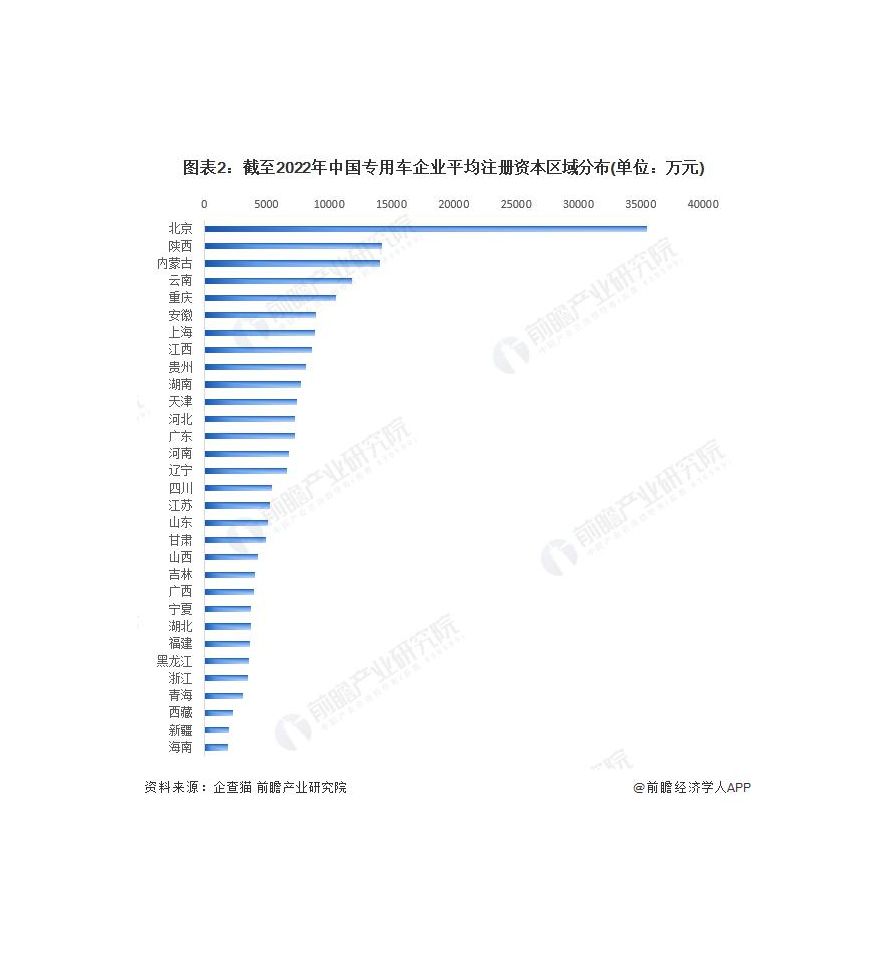 北京的專用車企業(yè)的平均注冊資本更高 根據(jù)中國企業(yè)數(shù)據(jù)庫企查貓,目前中國專用車企業(yè)的平均注冊資本區(qū)域分布中,北京企業(yè)的平均注冊資本最高,達(dá)到 35468 萬元。