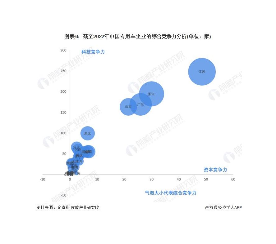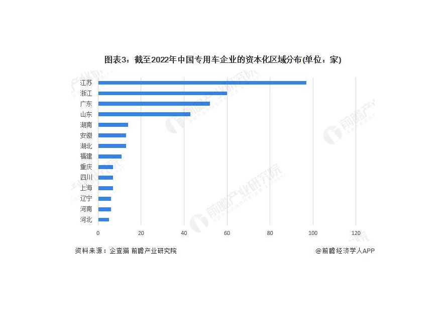 江蘇的資本化程度最高 根據(jù)中國企業(yè)數(shù)據(jù)庫企查貓,目前中國專用車資本化的企業(yè) ( 有融資信息和上市信息 ) 的主要分布在江蘇。截至目前,江蘇省共有存續(xù)和在業(yè)的資本化企業(yè)共計(jì) 97 家,其次為浙江的 60 家。