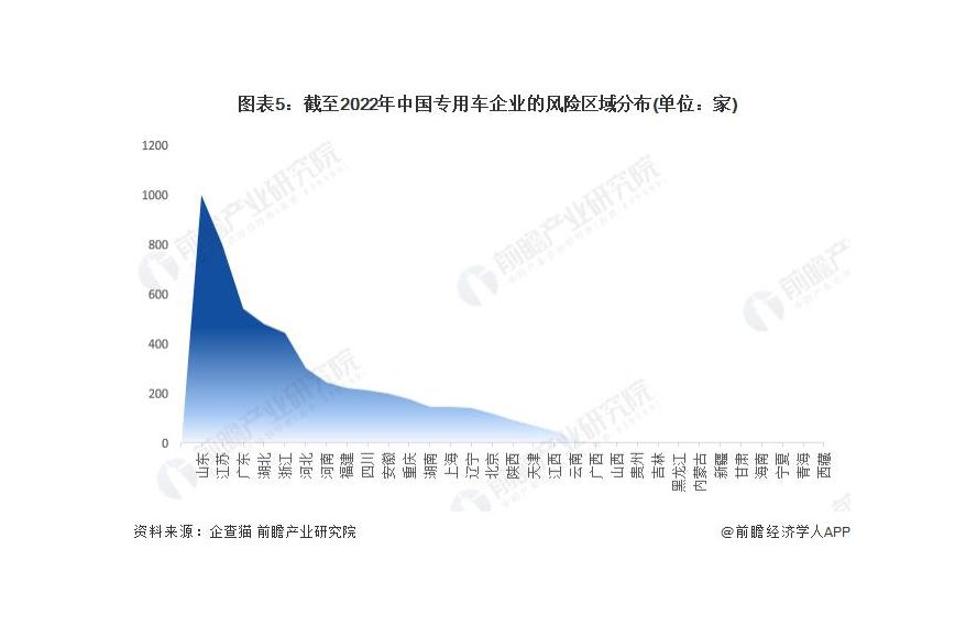 山東省和江蘇省的風(fēng)險(xiǎn)企業(yè)最多 根據(jù)中國企業(yè)數(shù)據(jù)庫企查貓,目前中國專用車有相關(guān)風(fēng)險(xiǎn)信息的企業(yè)主要分布在山東省和江蘇省等地。截至目前,江蘇省共有 1001 家企業(yè)涉及風(fēng)險(xiǎn)相關(guān)信息,而江蘇則有 799 家企業(yè)涉及風(fēng)險(xiǎn)相關(guān)信息。